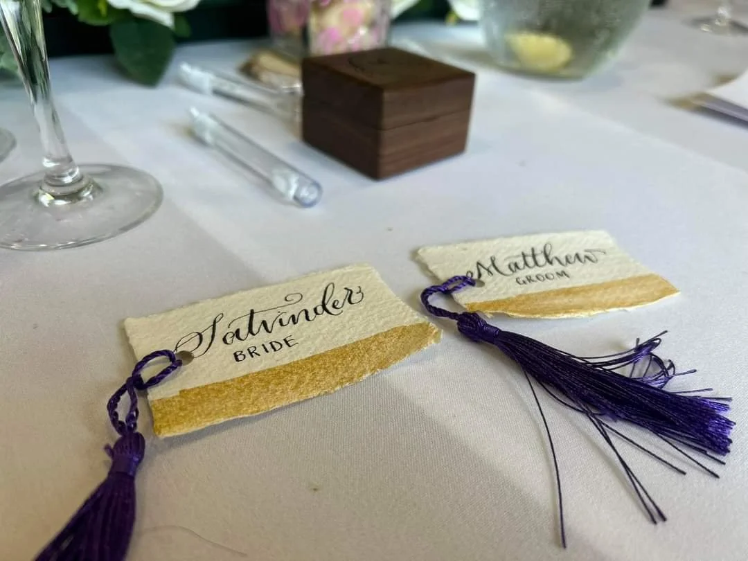 Finally, the placecards. I decided long before that I wanted to use Indian handmade Khadi paper with hand-torn edges to create a classic, romantic look. I wanted a rich Cadbury purple tassel and a watercolour wash along the bottom. I ended up choosing gold to give an elegant touch and a great compliment to the purple. I didn’t want the lettering to be gold too as I felt it would get lost on the cream coloured paper. Sumi black would stand out enough to grab the guest’s attention and make finding their seat easy (and a joy). These doubles as personalised bookmarks for our guests and pretty much all were taken home! So impressed were the staff when we delivered these the day before, I made a couple extra for them as thank yous.